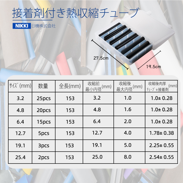 接着剤付き熱収縮チューブ キットタイプ 長さ153mm x 70本 内径3.2~25.4mm